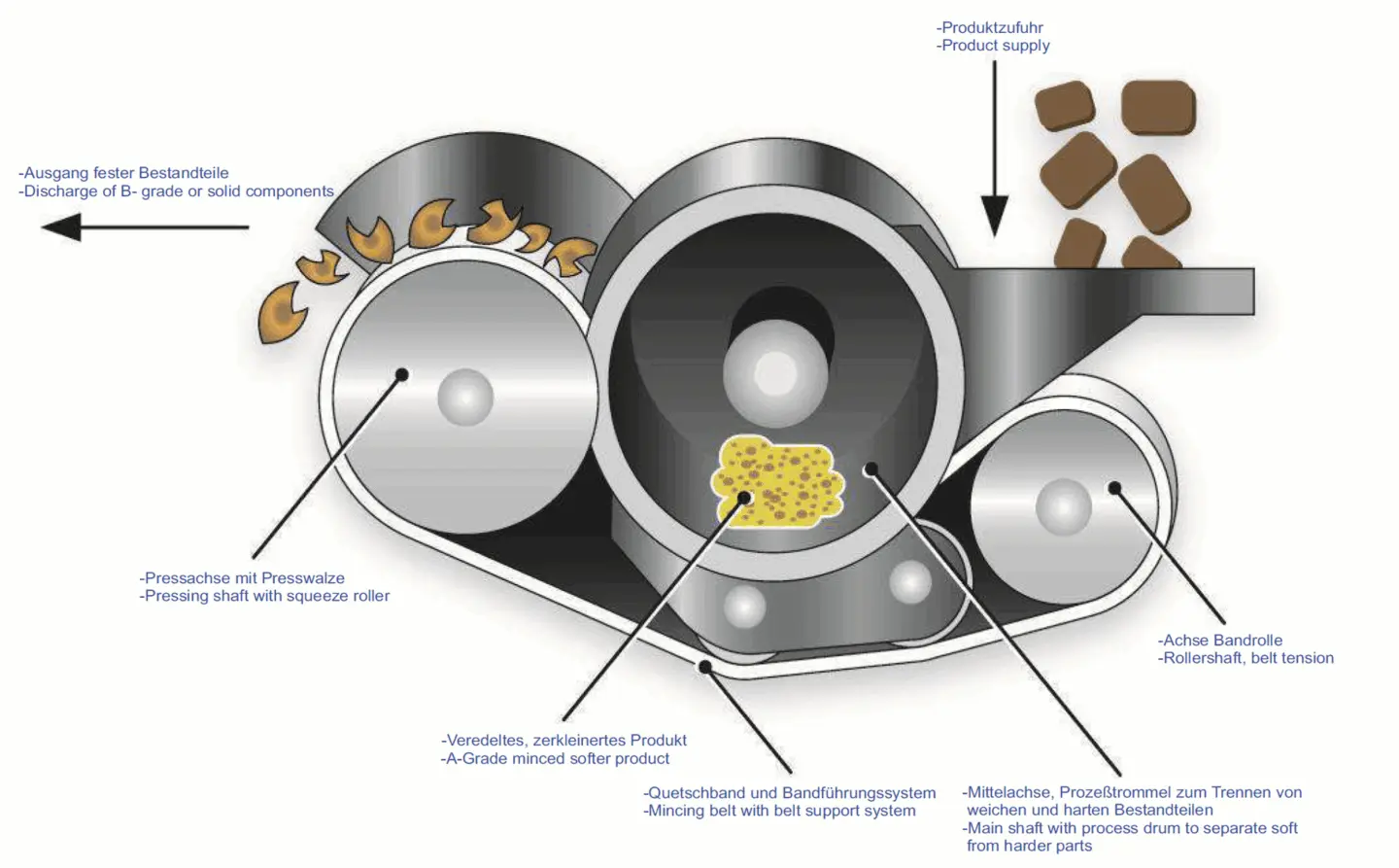 Meillä on tarjota useassa kokoluokassa separaattoreita mm. jänteiden, luiden, ruotojen ja kovien kalvojen erottelemiseen liha- ja kalaraaka-aineesta sekä esimerkiksi hedelmälihan erottamiseen siemenestä. Raskaampaan erotteluun meillä on tarjota luuprässejä, joilla on mahdollista hyödyntää liharaaka-aine kokonaisuudessaan erottelemalla tarkasti luuhun jäänyt liha.